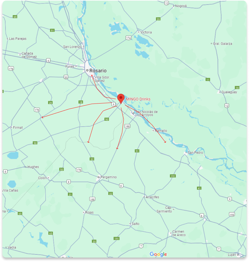 Tenemos una cobertura de zona desde Rosario hasta la localidad de San Pedro. Como asi también, hacemos despachos a todas las localidades nacionales.